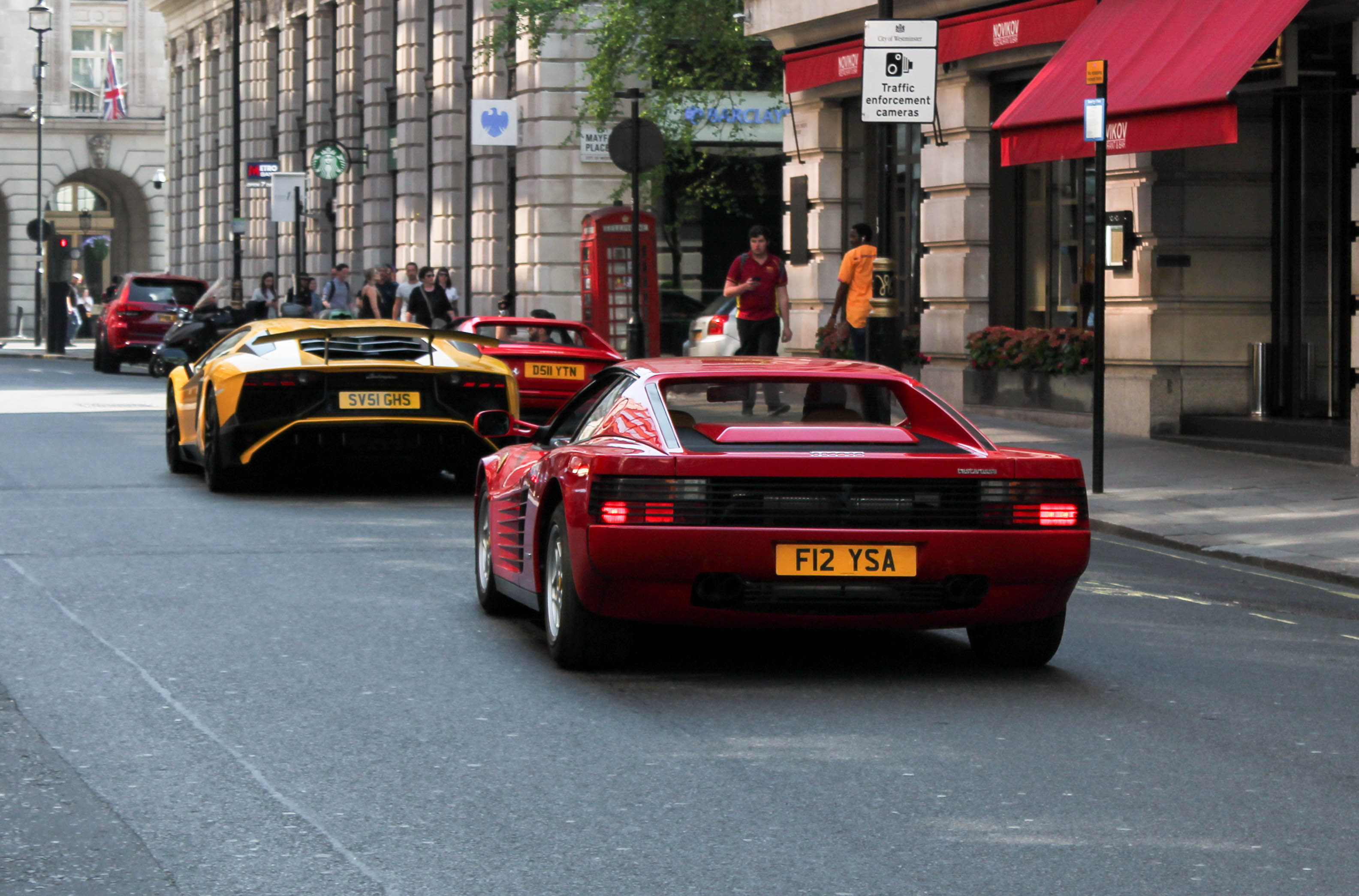 I was pleasantly surprised when this vibrant yellow Lamborghini Aventador SV pulled out from a side street near Green Park, but my surprise turned to elated shock when it was immediately followed by two immaculate classic Ferraris: a 328 GTS, and the poster child of the 1980s, the Testarossa. They crawled slowly down the street in a pack, the Aventador showing off its creases, angles, and towering rear wing, the Testarossa flaunting the iconic side strakes and grated taillight treatment, and the 328 looking more subdued with its smooth, elegant bodywork. The cars drew tons of attention from passer-by, who scrambled to grab their phones and snap a shot of the Italian trio creeping up to the stoplight. The owners then showed off the incredible engines sitting in the middle of each of their cars—the SV’s 740 hp V12 grumbled away, followed by the 328’s 3.2 liter, 270 hp V8, and lastly the incredible wail of the Testarossa 385 hp flat-12.